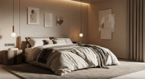 Minimalist bedrooms rely on lighting for warmth. Use warm LED bedside lamps, concealed strip lighting, or simple pendant lights.