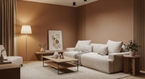 Soft brown wall shades create comfort and warmth in 2026 living rooms.
