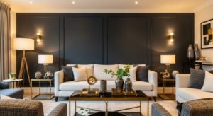 Luxury living rooms in 2026 are bold, dramatic, and elegant. Deep charcoal and graphite wall paints are trending, especially as accent walls. These dark tones add instant sophistication when paired with the right lighting and decor.
