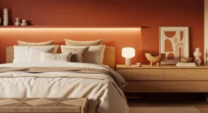 Terracotta tones add warmth and depth. Pair with cream bedding for balance.