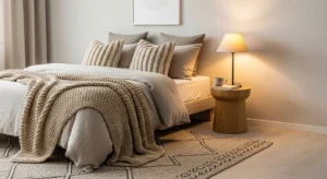 Texture is key in cozy bedroom decor. Combine knitted throws, boucle cushions, velvet pillows, and woven rugs to create visual interest.