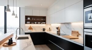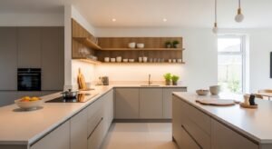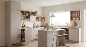 Smart layouts focus on functionality. Keep the work triangle efficient, and include hidden storage solutions to maintain visual calm. Open wooden shelves can soften the look and display minimal decor.