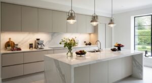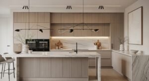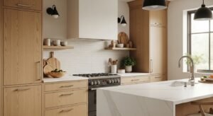 Flat-panel cabinetry with matte finishes is a key trend. Handleless cabinets keep the space sleek and uncluttered. Pair warm-toned cabinets with light quartz countertops and subtle backsplash tiles in creamy white.