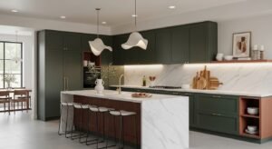 Choose matte finishes for a sophisticated feel. A waterfall island in matching tones creates cohesion. Keep countertops neutral to allow the cabinet colors to stand out.