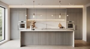 Fluted or ribbed cabinets add depth.