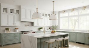 Popular combinations include white and sage green, beige and charcoal, or cream and navy. This approach prevents the kitchen from looking flat while maintaining balance.