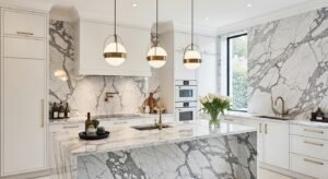 Backsplashes are becoming statement features in 2026 kitchens. Instead of small subway tiles, designers are using large-format tiles, marble slabs, or textured stone.