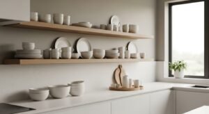 Use floating wooden shelves against neutral walls. Display ceramic dishes and glassware in coordinated tones.