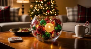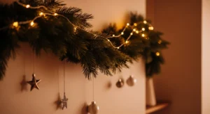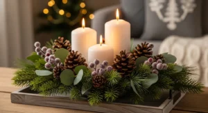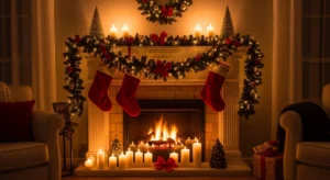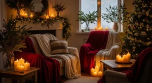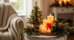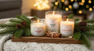 Scented candles and diffusers with pine, cinnamon, or vanilla create a festive atmosphere.