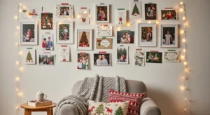 Create a holiday memory wall using photos, lights, and Christmas cards.