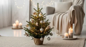 Choose a minimalist tree with simple ornaments like wooden stars, glass balls, or soft ribbon decorations.