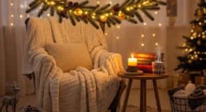 Add a small side table with a candle, pine branches, and a mug of hot chocolate. A floor lamp or string lights above the chair can provide warm lighting.