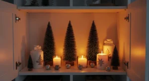 Decorate open shelves with small trees, candles, and holiday figurines.
