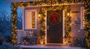 Wrap soft white string lights through a fresh pine garland placed around the door frame. You can also mix in eucalyptus branches, pinecones, or berries for texture.