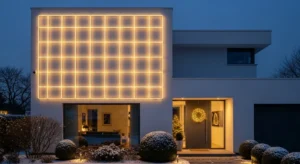 Create a geometric lighting pattern on the exterior wall using evenly spaced lights.