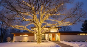 Use cone-shaped LED tree lights or wrap lights around a real outdoor tree. Choose warm white lights or soft gold tones for a modern look.