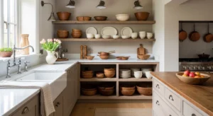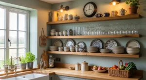 Open shelving with country-style items such as ceramics, wooden bowls, and copper pans enhances charm. Pair with neutral walls and subtle wooden accents. Use baskets and jars for functional and decorative purposes.