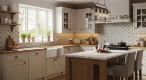 Subtle patterned tiles add charm without overpowering. Soft florals, geometric patterns, or classic subway tiles work in 2026 modern country kitchens. Choose muted colors to complement neutral palettes. Backsplash behind the stove or sink draws the eye while remaining functional.