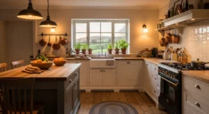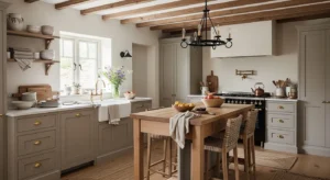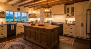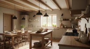 Modern country kitchens lean toward warm neutrals such as taupe, cream, and soft greys. Use these on walls, cabinets, or backsplashes. Wooden elements and brass accents complement the palette beautifully. Add textured rugs or natural fiber mats for an earthy feel. Lighting should remain soft and warm to highlight the cozy ambiance.