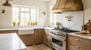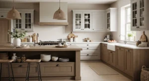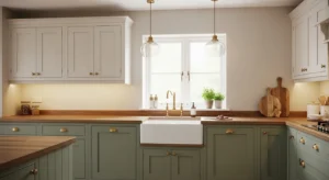 Shaker-style cabinetry offers timeless appeal. This 2026 trend merges country charm with minimalism. Opt for muted greens, blues, or warm creams for the cabinetry. Wooden countertops and brass handles add elegance, while neutral walls ensure the kitchen feels open and welcoming. Shaker doors work perfectly with pendant lighting and farmhouse sinks, blending traditional and modern design.