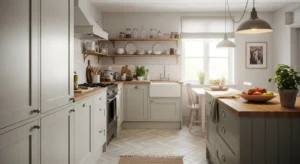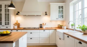 White cabinets remain the heart of country kitchens in 2026. Pair them with wooden countertops for warmth and a subtle vintage touch. Adding black matte handles and soft pendant lighting balances traditional charm with modern style. Walls in cream or soft beige create a bright, airy feel. To enhance country authenticity, add open shelves displaying ceramics or mason jars. Flooring in light oak or herringbone tiles completes the look.