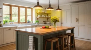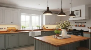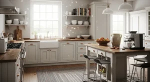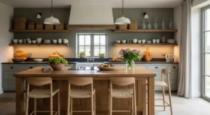 Open shelving remains a top trend, providing both practicality and style. Showcase ceramics, wooden bowls, and glassware for country charm. Light wood or painted shelves paired with a subtle wall color like sage green or soft cream creates an inviting vibe. Add under-shelf lighting to highlight items and modernize the space.