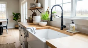 The classic apron-front sink continues to dominate country kitchens. White or copper sinks paired with matte black or brushed nickel faucets offer a perfect mix of rustic and modern. Surround the sink with wooden countertops or marble surfaces for contrast. To keep the 2026 look fresh, incorporate minimal decor and soft wall hues.