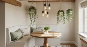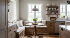 Country kitchens are incorporating intimate breakfast areas. Wooden benches, cushions, and a small table create warmth. Add pendant lighting above and place near windows for natural light. Neutral colors and greenery enhance the cozy vibe.
