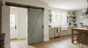 Sliding barn doors for pantry or kitchen entries are trending. Painted wood in muted tones complements the overall country palette. Black hardware or rustic handles add contrast. Doors can also act as statement pieces without crowding the space.