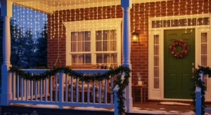 Hang curtain lights behind the porch area or columns. The cascading lights create a dreamy holiday atmosphere.