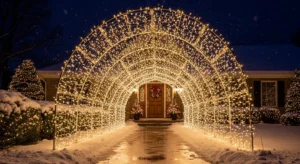 Create a glowing archway over your front walkway using flexible string lights. The arch design makes the entrance feel magical and welcoming.
