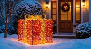 Glowing gift box decorations near the entrance add a playful festive touch.