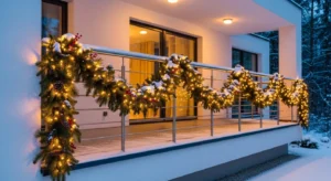 If your home has a balcony or porch railing, wrapping it with garland and lights is a beautiful decorating option. Start with a lush pine garland and weave warm LED string lights through the greenery.