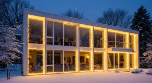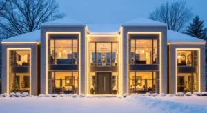 Thin LED strips outlining window frames create a modern holiday lighting look.