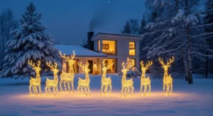 Lighted reindeer decorations placed in the yard create a charming holiday scene.