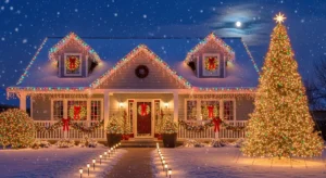 Combine roofline lights, tree lights, pathway lights, and porch lights for a complete festive display.