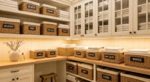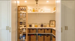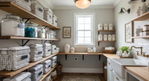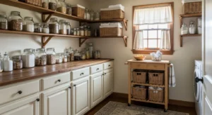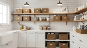Integrate laundry hampers into your pantry design for ultimate efficiency. Hidden compartments or pull-out hampers keep dirty clothes separate while maintaining farmhouse charm. Use white or cream cabinetry with wood trim and soft matte handles. Above, open shelves store pantry essentials or decorative items. This multifunctional design is perfect for small spaces, blending utility with style.