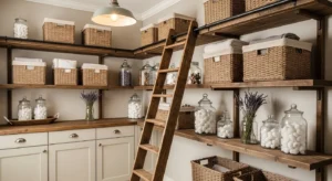 Tall pantry cabinets can be complemented with a rustic wooden ladder, adding farmhouse drama and function. Wooden shelving with baskets and labeled jars creates organized storage while the ladder allows easy access to upper shelves. 2026 trends favor natural finishes, neutral tones, and tactile textures, so choose reclaimed wood for authenticity. Add a small pendant or wall sconce to highlight the space.