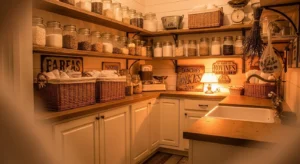 Install decorative hooks along the pantry walls to hang cloth bags, aprons, or cleaning tools. Pair with wooden shelves, wicker baskets, and glass jars for the ultimate farmhouse charm. Painted cabinets in cream or muted sage green complete the look. Hooks add versatility and accessibility, aligning with 2026 trends emphasizing practical yet charming storage solutions.