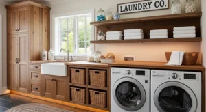 Combine laundry and pantry storage for maximum efficiency. Include a countertop above the washer and dryer for folding clothes, with shelves above for pantry storage. Wooden cabinets with farmhouse-style handles create a cohesive rustic look. Inside the pantry section, integrate pull-out bins for dry goods, cleaning supplies, or laundry products. 2026 trends favor natural wood finishes and neutral painted cabinets for farmhouse charm. Add hooks on the wall for aprons, cloth bags, or small tools. This idea emphasizes practical use without sacrificing style, turning a functional space into a charming, organized hub.