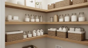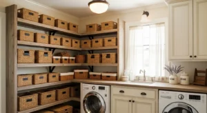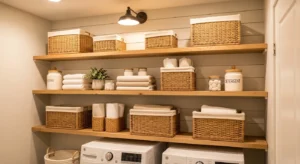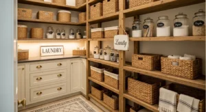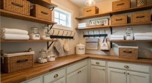 Floating wooden shelves add a modern farmhouse twist to a laundry room pantry. Keep them simple with soft painted finishes or natural reclaimed wood. These shelves are ideal for storing baskets, glass jars, or decorative items. Add farmhouse accents like metal hooks for hanging cloth bags, or a small wooden sign. Soft, warm lighting completes the cozy vibe. This layout is perfect for small laundry rooms where wall space is limited but style is a .