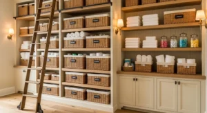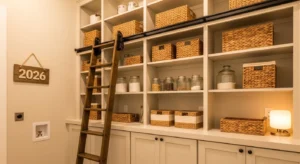 Incorporate a sliding ladder in your laundry room pantry for a dramatic farmhouse-inspired touch. Tall shelving units allow storage for seasonal items or bulk pantry goods, while the ladder adds visual interest and practicality. Use natural wood finishes with black hardware to maintain a rustic charm. Label baskets and jars for organized access. This 2026 trend combines function with statement design, making the pantry both practical and Instagram-worthy.