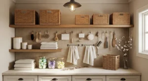 A pegboard inside a pantry wall is a clever way to hang utensils, small baskets, or cleaning tools. Paint the pegboard in soft white or muted pastels to maintain farmhouse charm. Wooden shelves above can hold decorative jars or folded towels. 2026 trends embrace versatile, functional surfaces that are also visually appealing. This layout is practical for both laundry and pantry storage.