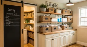 Incorporate a chalkboard door or section on your laundry pantry for a rustic touch. Chalkboards are both decorative and functional, letting you label pantry sections, jot reminders, or add seasonal quotes. Pair with cream or soft gray cabinets and wooden shelves to maintain farmhouse charm. Inside, organize with wicker baskets and ceramic jars. This design trend for 2026 adds personality while keeping a neutral and cozy palette. Overhead lighting or a small vintage sconce ensures both style and visibility.