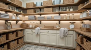 Make use of corner spaces with an L-shaped pantry in your laundry room. This layout maximizes storage without crowding the room. Include adjustable shelves, pull-out baskets, and labeled bins to keep supplies organized. A farmhouse wooden countertop above the washer and dryer can double as a folding station. Light-colored cabinetry with natural wood accents keeps the space bright and inviting. Small pendant lighting or under-shelf LED strips highlight the area, making the pantry both functional and aesthetically pleasing.