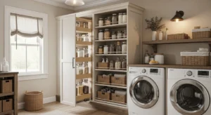 A pull-out pantry is a smart, space-saving option. Tall, narrow cabinets with sliding shelves fit perfectly in a laundry room, hiding essentials from view. Choose distressed wood or painted finishes for a farmhouse feel. Inside, organize with labeled jars, wicker baskets, and stackable bins. This 2026 trend allows you to store more items in a small footprint without cluttering the room, maintaining clean lines and farmhouse charm.