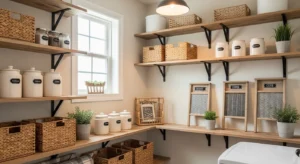 Maximize the laundry room pantry with open shelving, a hallmark of farmhouse design. Install thick wooden planks with sturdy black metal brackets for a timeless look. Use woven baskets, wire bins, and labeled jars to organize laundry essentials, pantry items, or cleaning supplies. Neutral tones like cream, beige, and soft gray keep the space airy, while a single pop of color (like a navy or olive towel) adds visual interest. Add small decorative touches such as framed vintage signs or a small chalkboard for labeling. For 2026, layered lighting—overhead plus under-shelf LED strips—ensures both style and functionality.