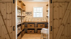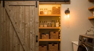 Incorporate a sliding barn door to conceal your laundry room pantry. The barn door adds classic farmhouse flair and doubles as a statement piece. Choose distressed wood or painted finishes like soft cream or sage green for 2026 trends. Inside the pantry, use deep shelves for storing laundry supplies, dry goods, or household items. Open shelving at eye level helps highlight decorative jars or neatly folded towels. For lighting, a warm overhead fixture or wall sconce complements the rustic aesthetic. The sliding mechanism saves space, making it ideal for narrow laundry rooms while creating a functional, stylish pantry solution.